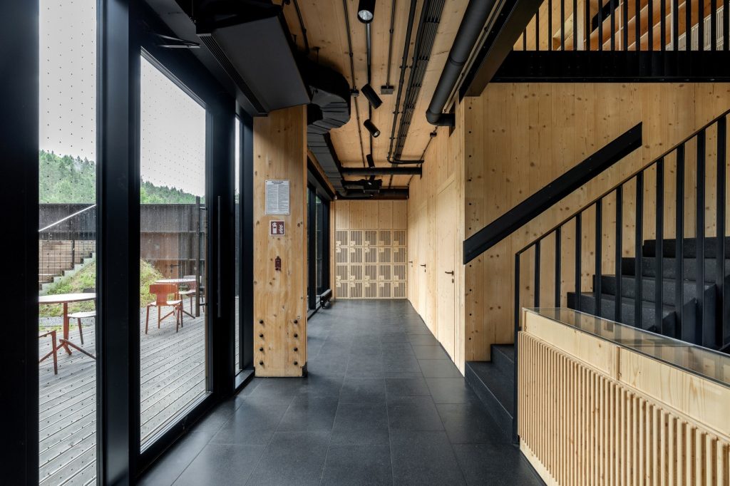 Widoczna konstrukcja drewniana została świadomie wykorzystana jako element edukacyjny, pokazujący użytkownikom sposób działania budynku i rolę drewna jako nowoczesnego materiału konstrukcyjnego.