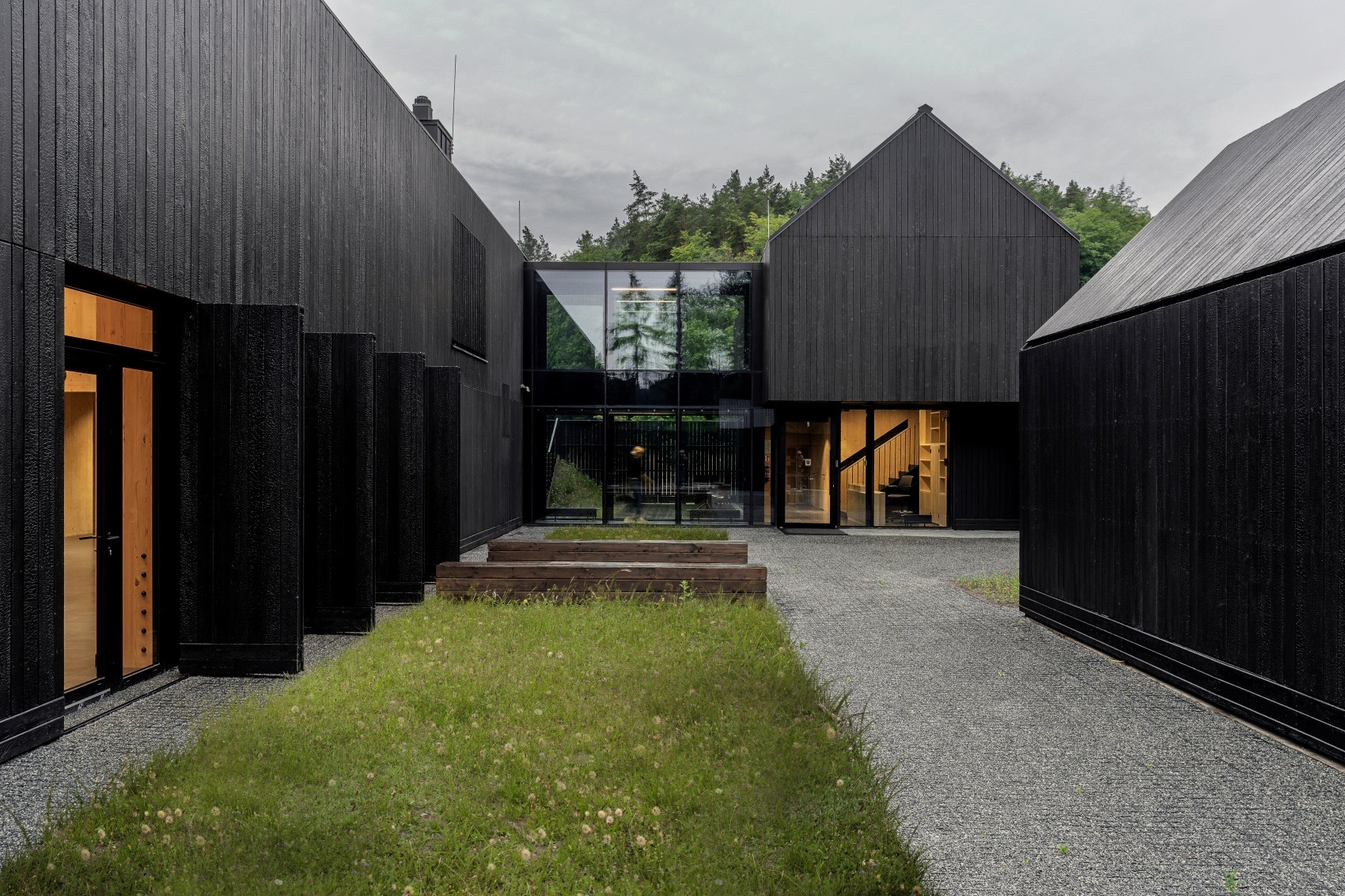 Płyty CLT pełnią podwójną funkcję – konstrukcyjną i wykończeniową; część ścian pozostawiono widoczną we wnętrzach. Elewację wykonano z modrzewia opalanego metodą shou sugi ban, co zwiększa odporność drewna na wilgoć, grzyby i promieniowanie UV bez chemicznej impregnacji.