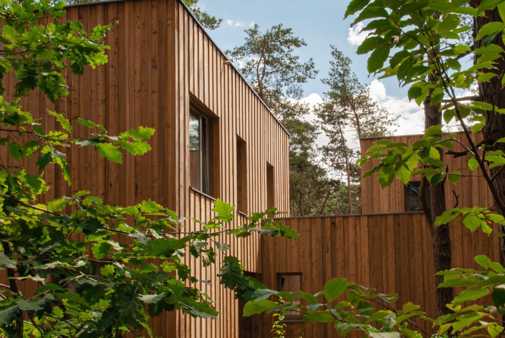 CLT, zapewniając tym samym trwałość i stabilność całości obiektu. Zastosowany materiał zapewnia również znakomitą izolację akustyczną i termiczną. Drewno CLT doskonale sprawdza się w tworzeniu harmonijnych i ekologicznych przestrzeni, łączy nowoczesność z naturą i tworzy przyjazny mikroklimat we wnętrzach. Budynek spełnia wszystkie potrzeby funkcjonalne użytkowników i zarazem dba o ich zdrowie, dzięki drewnianym ścianom, które są dyfuzyjnie otwarte. W budynku znajdują się przestronne okna, które zapewniają odpowiedni poziom naturalnego światła we wnętrzach. Prócz części mieszkalnej znajdują się również sale do zajęć rekreacyjnych, w których organizowane są warsztaty dla dzieci i młodzieży. Elewacja została obłożona deską modrzewiową, zabezpieczoną impregnatem, zachowując naturalny kolor drewna, dzięki czemu budynek harmonijnie wtapia się w okoliczną naturę.