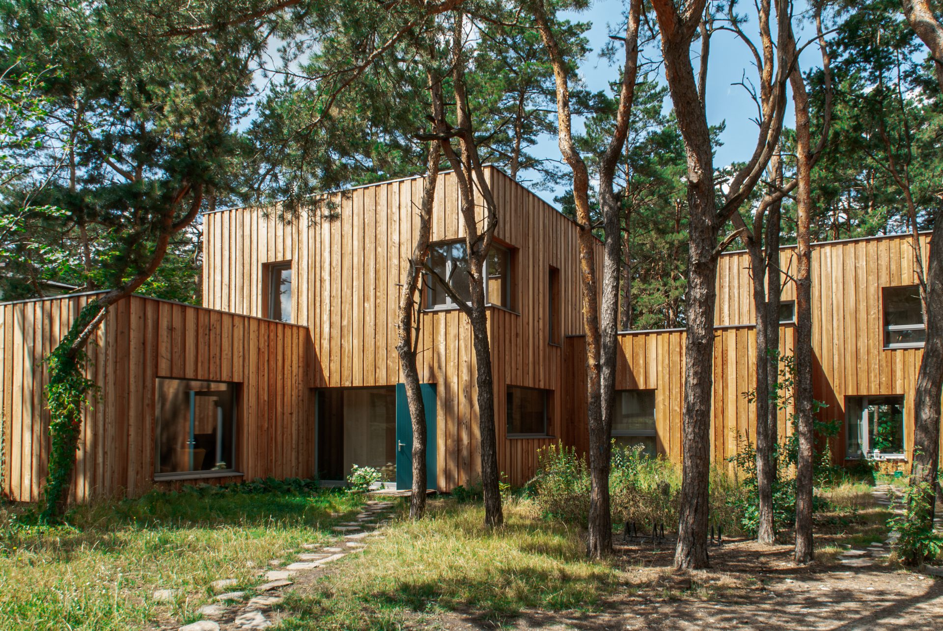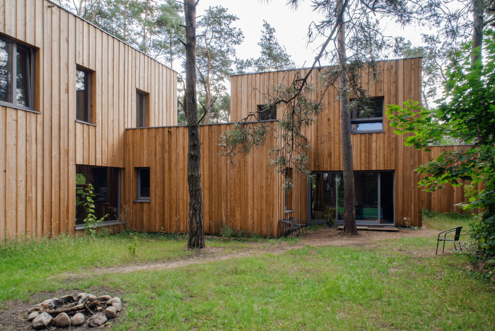 CLT, zapewniając tym samym trwałość i stabilność całości obiektu. Zastosowany materiał zapewnia również znakomitą izolację akustyczną i termiczną. Drewno CLT doskonale sprawdza się w tworzeniu harmonijnych i ekologicznych przestrzeni, łączy nowoczesność z naturą i tworzy przyjazny mikroklimat we wnętrzach. Budynek spełnia wszystkie potrzeby funkcjonalne użytkowników i zarazem dba o ich zdrowie, dzięki drewnianym ścianom, które są dyfuzyjnie otwarte. W budynku znajdują się przestronne okna, które zapewniają odpowiedni poziom naturalnego światła we wnętrzach. Prócz części mieszkalnej znajdują się również sale do zajęć rekreacyjnych, w których organizowane są warsztaty dla dzieci i młodzieży. Elewacja została obłożona deską modrzewiową, zabezpieczoną impregnatem, zachowując naturalny kolor drewna, dzięki czemu budynek harmonijnie wtapia się w okoliczną naturę.