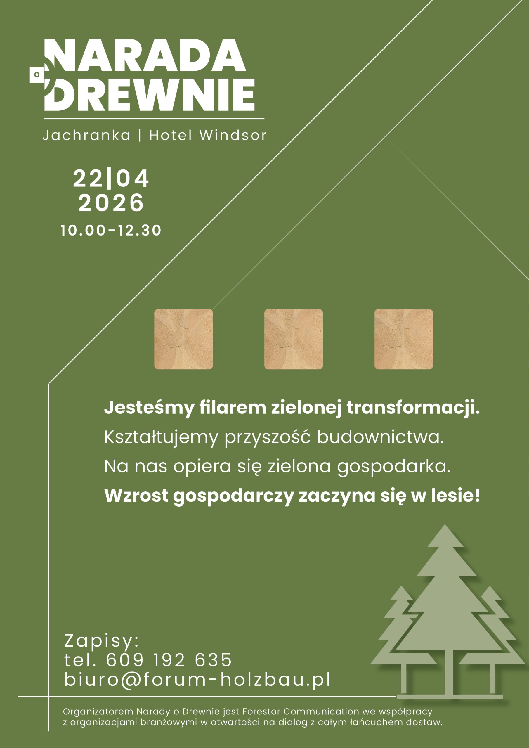 Budownictwo drewniane szczególnie prefabrykowane stało się z kluczem do realizacji celów klimatycznych i zielonej transformacji gospodarki. Drewno konstrukcyjne jest materiałem strategicznym dla przyszłości budownictwa. Właśnie dlatego podczas prestiżowego Forum Holzbau Polska w Jachrance koło Warszawy 22 kwietnia 2026 organizujemy Naradę o Drewnie – ogólnopolską debatę przedstawicieli całego łańcucha wartości: od gospodarki leśnej, przez producentów drewna konstrukcyjnego, po firmy realizujące budownictwo drewniane w Polsce i Europie.