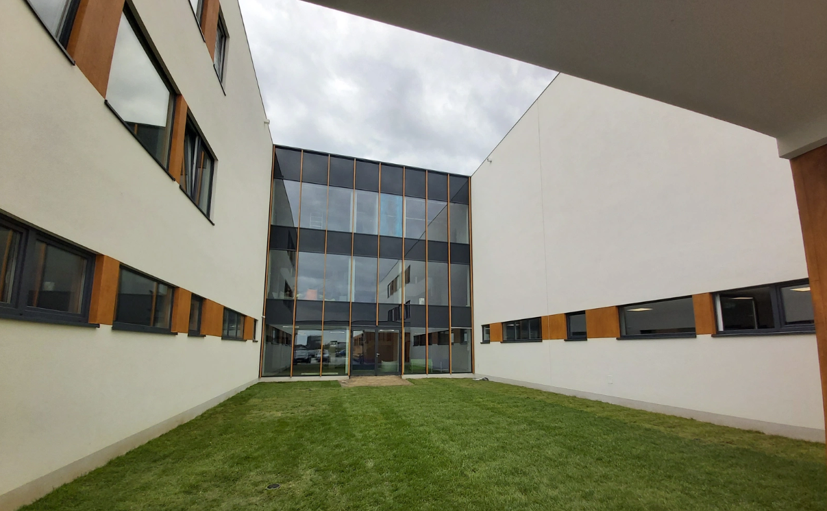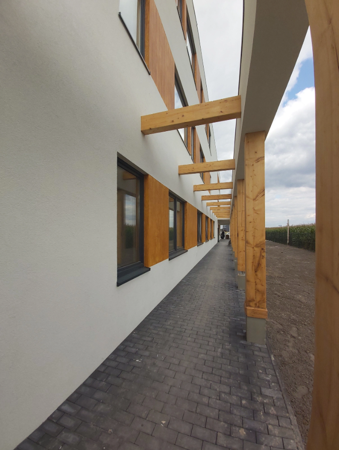 Konstrukcję obiektu wykonano z prefabrykowanych paneli z drewna konstrukcyjnego, uzupełnionych elementami z drewna klejonego i forniru klejonego warstwowo, co umożliwiło realizację funkcjonalnych i przestrzennie złożonych układów typowych dla współczesnych szkół. Uzupełnieniem rozwiązań prośrodowiskowych jest system retencji wód opadowych. Realizacja potwierdza, że budownictwo drewniane prefabrykowane może być skutecznie stosowane w dużych obiektach użyteczności publicznej i stanowić punkt odniesienia dla kolejnych inwestycji edukacyjnych.